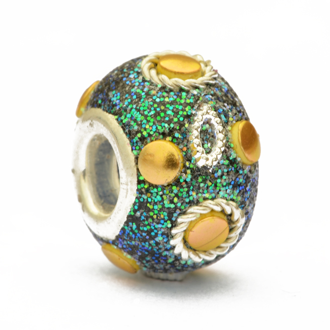 15 x 11 mm, teal glitter, handmade kashmiri euro style bead having 5 mm hole size. Hand-studded with silver plated rings & accessories. Price mentioned below are for 50pc beads.