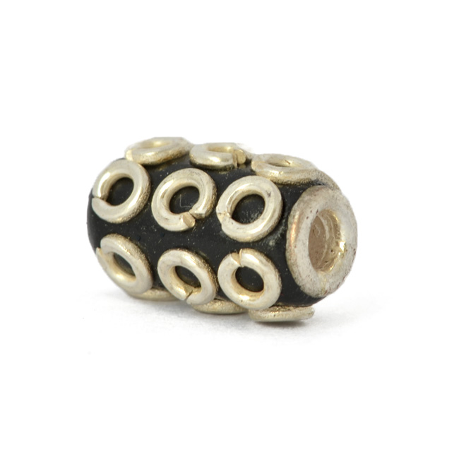 14 x 9 mm, cylindrical, handmade kashmiri bead having 3 - 3.5 mm hole size. Hand-studded with silver plated rings. Price mentioned below are for 50pc beads.