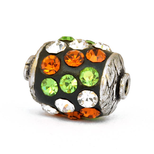 16 x 14 mm, black base, cylindrical, handmade maruti bead with silver plated side caps having 2 - 3 mm hole size. Hand-studded with white, green and orange rhinestones. Price mentioned below are for 25pc beads.
