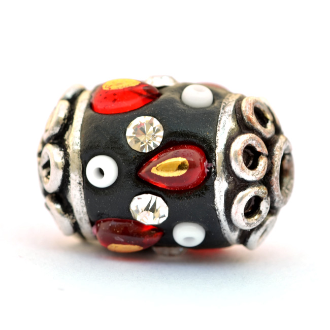 18 x 12 mm, black base, cylindrical, handmade maruti bead with silver plated side caps having 2 - 3 mm hole size. Hand-studded with white seed beads, white rhinestones and pear-shaped accessories. Price mentioned below are for 25pc beads.