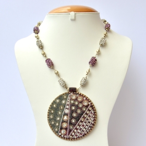 20 inches long necklace, set with 3 inches round shaped kashmiri pendant, 10 pieces of 10 x 14 mm white & purple rhinestone beads and silver plated brass balls with easy to use toggle clasp. Sold individually.