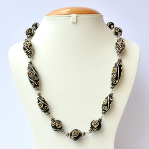 24 inches long necklace set with, 15 pieces of handmade black kashmiri beads ranging from 13 - 40 mm in size, silver plated copper spacer beads and silver plated brass balls with easy to use toggle clasp. Sold individually.